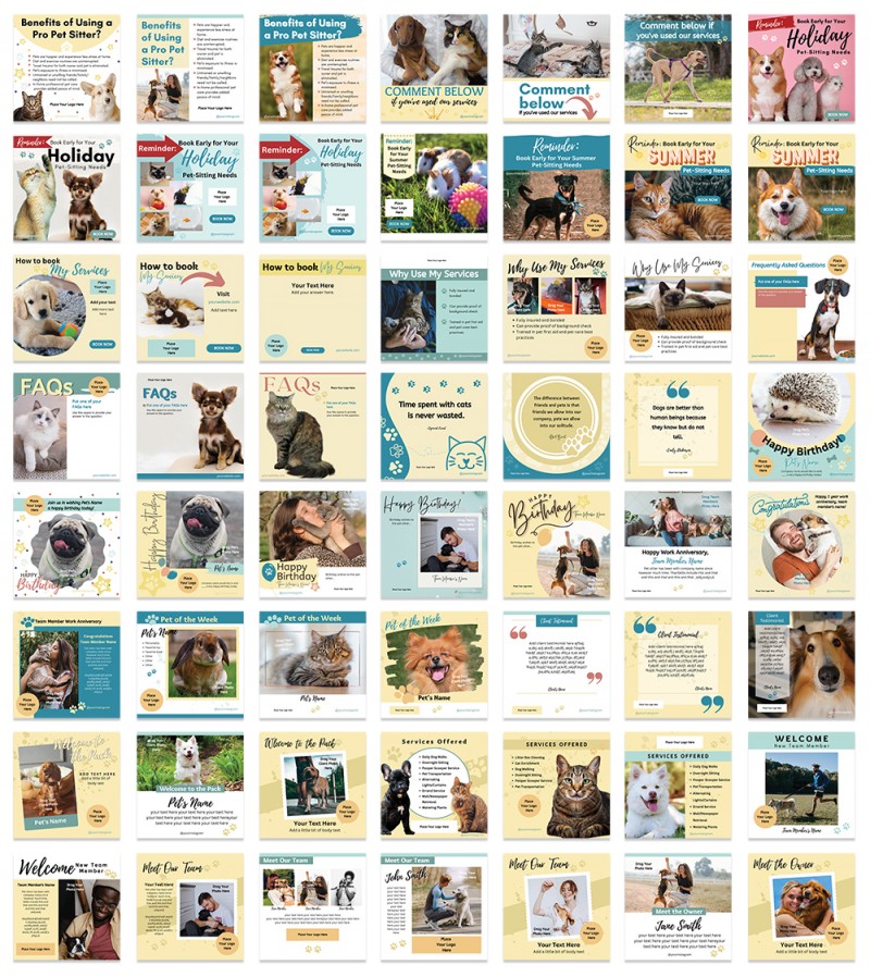 - The bundle includes 56 social-media images ranging from “Meet the Owner” posts to posts sharing client photos or pet tips.